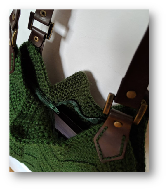 To make Laurel Bag you will need: 3 balls of Paintbox simply chunky yarn in Racing Green, 15 inch zip in Dark Green, 2 flat brown 30.5 inch handles, Darning needle. Tools required: 5.0 mm, Scissors.
