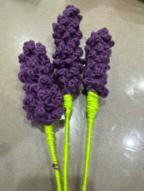 To make Lavender you will need: Purple Yarn, Green Yarn, Wire. Tools required: 6mm, Hot Glue Gun.