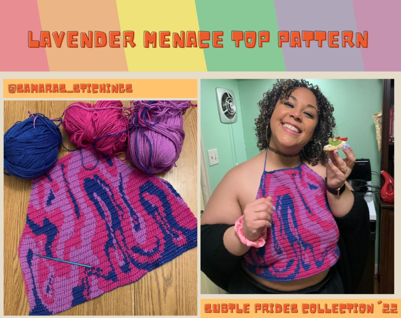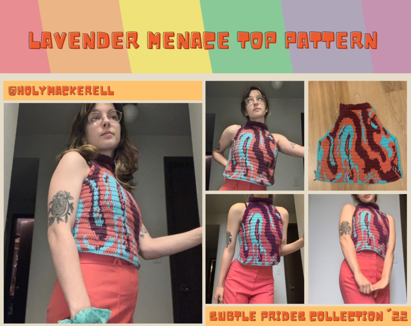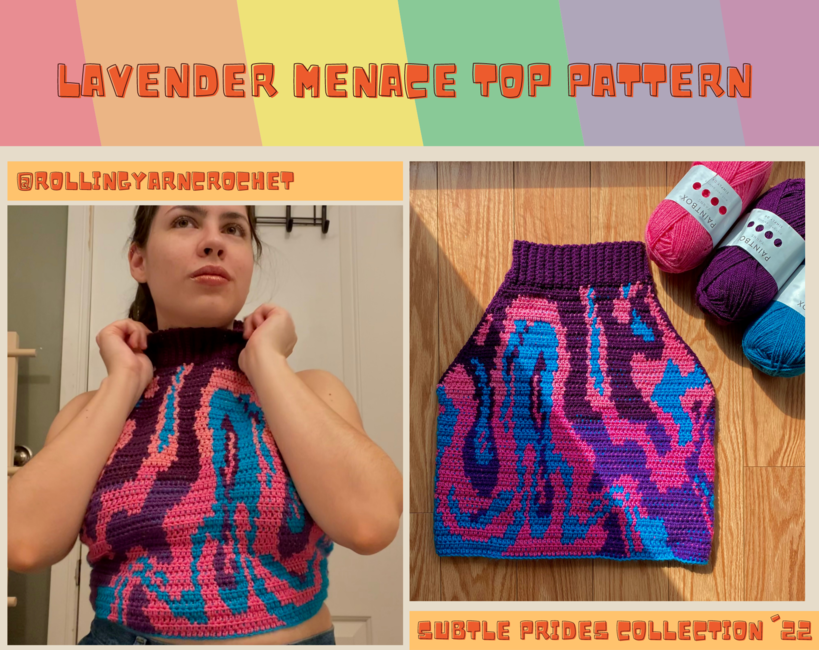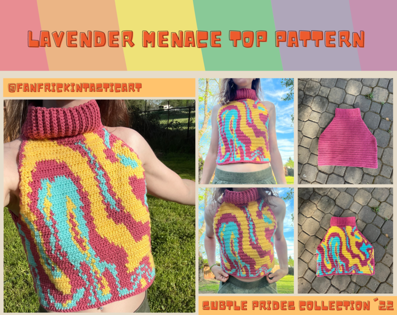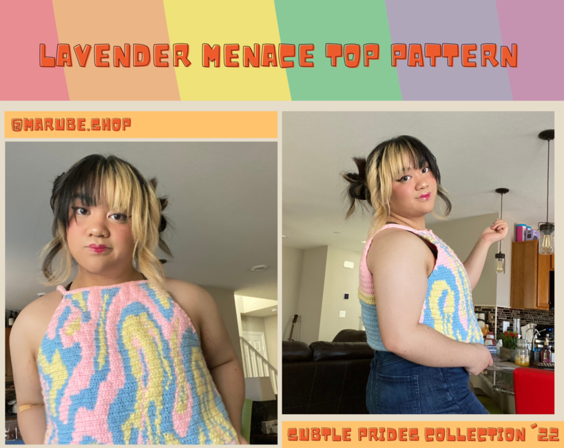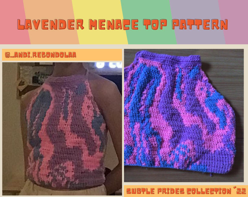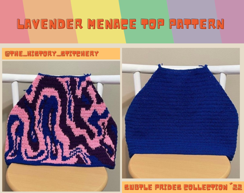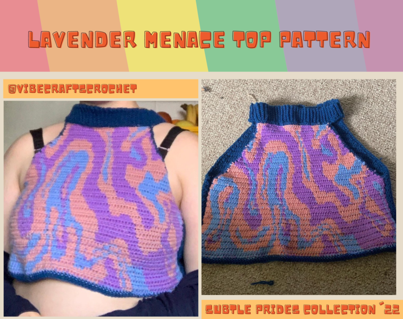 Hello, and Happy Pride 2022! Thank you so much for purchasing the Lavender Menace Pride Top pattern. This is part of my Subtle Prides Collection for Pride Month '22! This is a super cute halter top with a ribbed mock neck, with a groovy-inspired version of the Bi/Pan/Genderqueer Pride Flags in 6 different sizes. The colors used in the pattern correspond to the Bi pride flag, but you can adapt the pattern to recreate a groovy-inspired version of any pride flag that has 3 colors (like the pansexual and genderqueer flags) simply by changing the colors! This top is originally a cropped top, but the pattern includes optional instructions to adjust the length. The pattern also includes instructions for creating either the original version with a back panel, or a backless version. This pattern uses hdc stitches and tapestry/colorwork crochet techniques, such as carrying yarn as you crochet, and switching color yarns throughout the pattern to create the groovy design, so this is the perfect pattern for someone with an intermediate to advanced level.