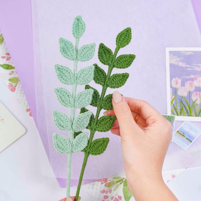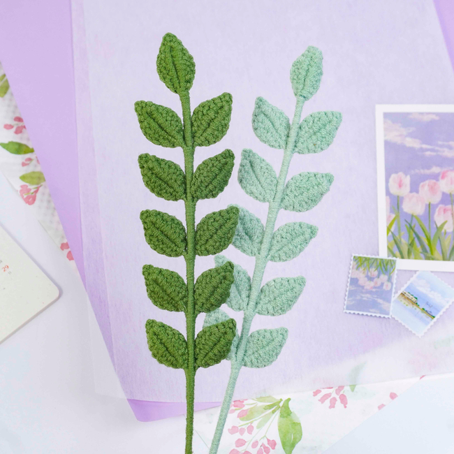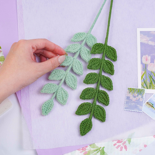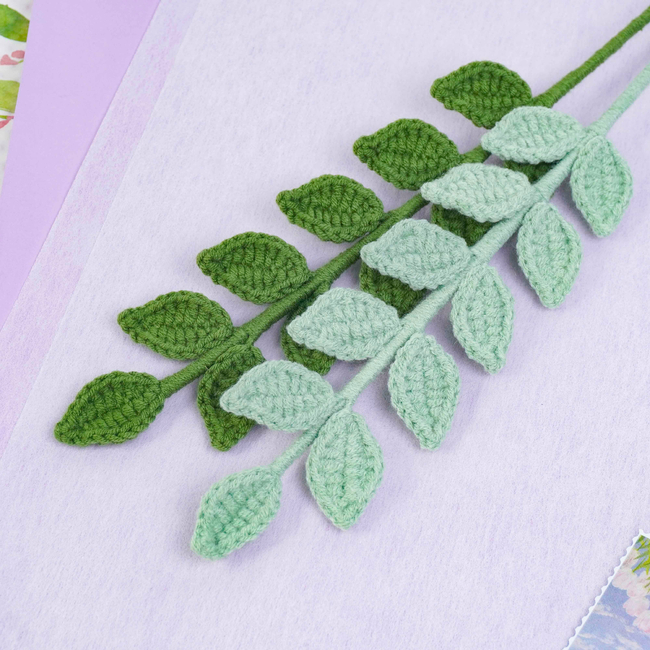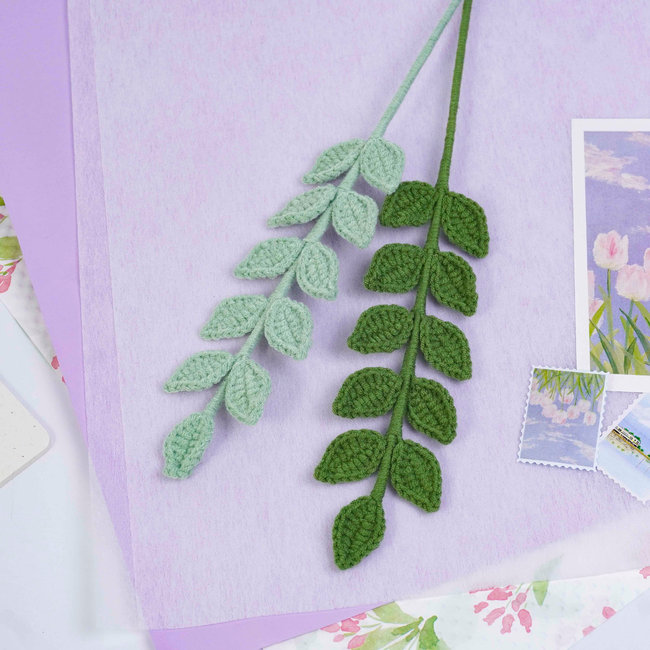 To make Leaf Branch Crochet Pattern you will need: but you can use any kind of yarn of your choiceColor: Green, Stitch markerSewing needleScissors Floral Stem (2mm*30cm)Craft wire (0.5mm)Hot glue gun. Tools required: 2.5mm.