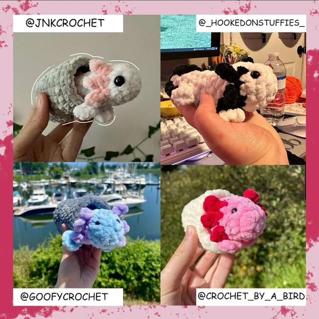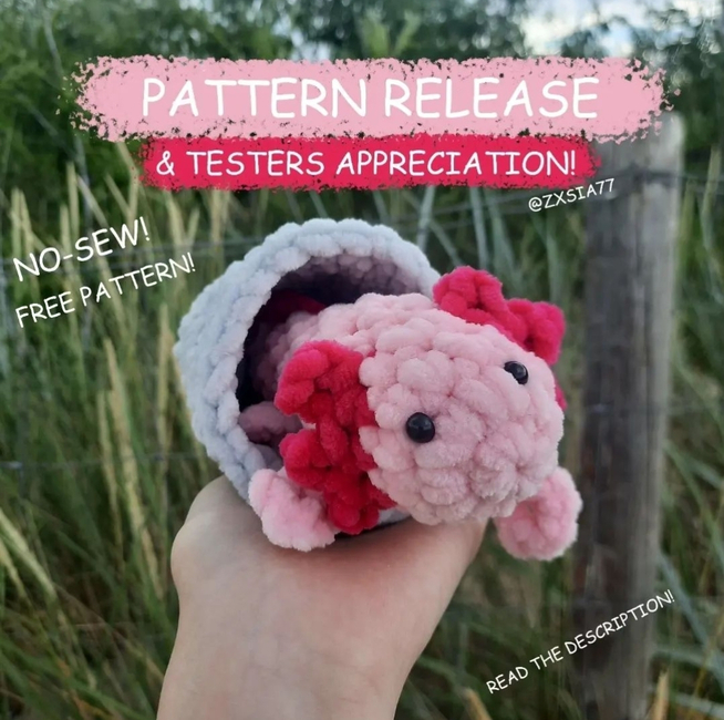 Hi guys! Here's my "new" pattern for you! This pattern was actually free on my discord only but we hit 142 followers and my first pattern was on "trends" on ribblr and I want to thank you so much guys for that! On the second and third photo you can see work of my lovely testers (please give them some love on instagram for great work <3) If you have any errors with the pattern feel free to DM me on instagram. Thank you so much guys and have fun with making your own leggy axolotl in a bucket <3