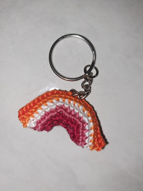 A lesbian flag Keychain, can be customizable into different colors and flags. I used embroidery yarn so it has that size, and I used a 2.5 mm hook.