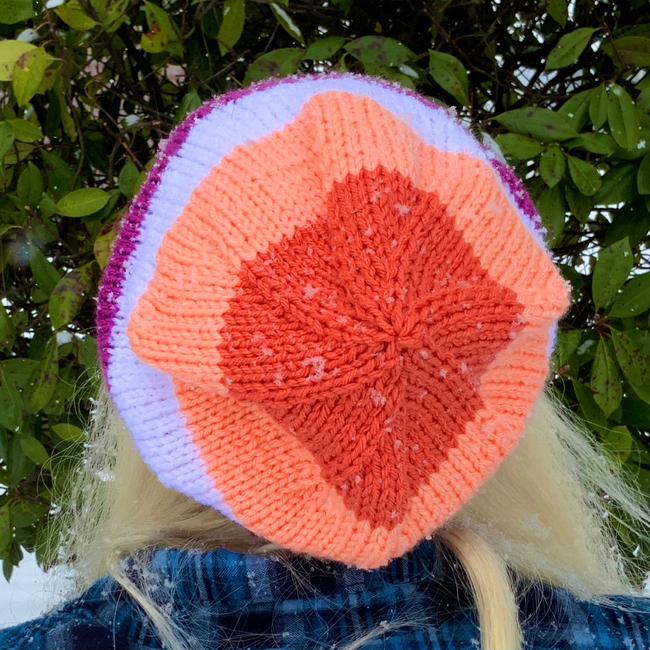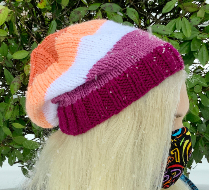 Show your pride with this simple yet stylish slouchy beanie! Worked flat with stockinette stitch and ribbing, it is a great pattern for beginners looking to branch out with some new techniques.