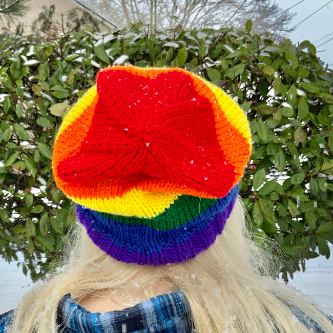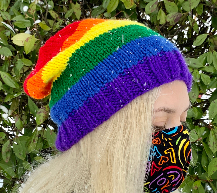 Show your pride with this simple yet stylish slouchy beanie! Worked flat with stockinette stitch and ribbing, it is a great pattern for beginners looking to branch out with some new techniques.
