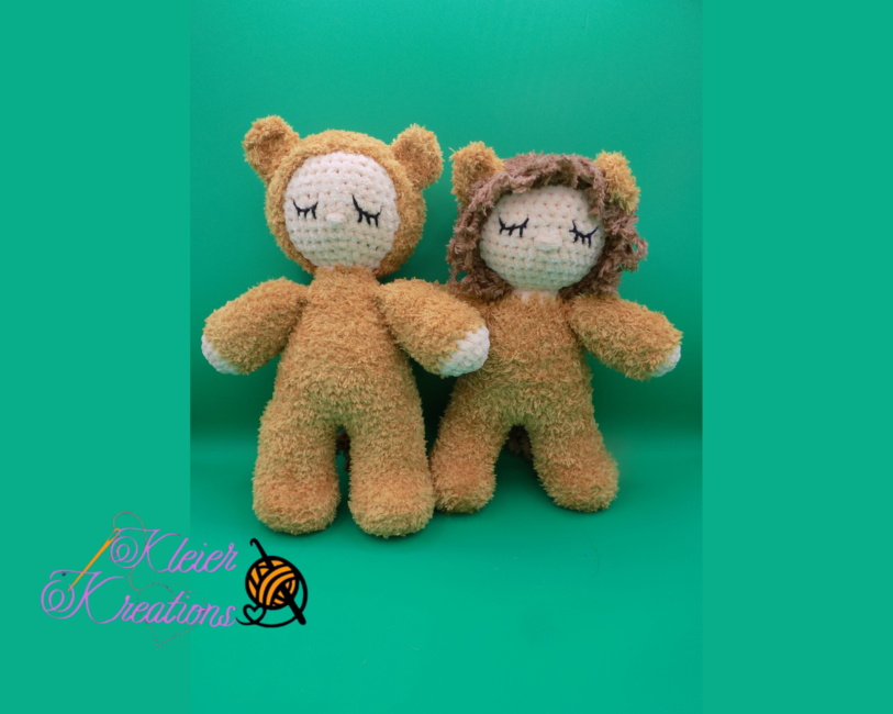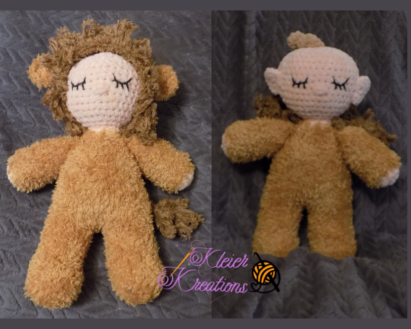 This bundle includes patterns for both my lion & lioness baby doll patterns. They are for early intermediate crocheters. You will be crocheting arms, legs, & tail on as you go. The hood, ears, & facial features will be sewed on. This pattern is an original of mine. It is for personal use only. Do not copy or sell the pattern. You are welcome to sell your finished product, but please give me pattern credit when posting online.