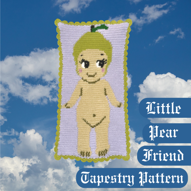 This tapestry is inspired by my pear Sonny Angel! Using the size and brand of yarn I used, it came out to be about 14.5 X 26 inches. I use push pins to hang it, but you could also attach wooden dowels and hang that way as well! Please tag me in your creations on Insta/TikTok @wildwildknits, I would love to see them!!