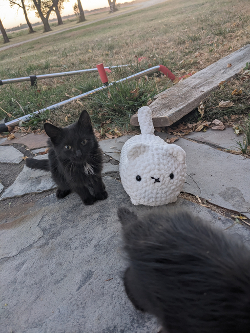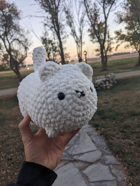 This is a loaf cat pattern that is pretty big, i can hold it in one hand, and it is almost no sew. the only part you have to sew in is the the tail, the ears and legs are built into the cat. I used 12mm eyes for my cat, but i would recommend using a bigger size like a size 14mm. If you have any questions at all, please feel free to contact me.