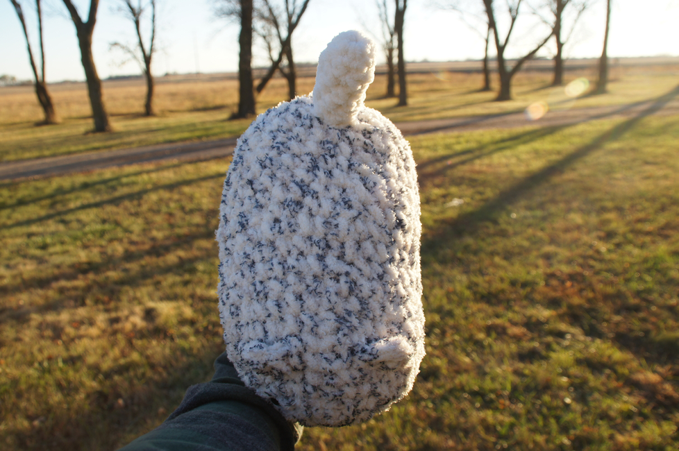 I used a #6 bernat baby blanket yarn in the color white A small scrap of black or pink yarn for the mouth and butthole