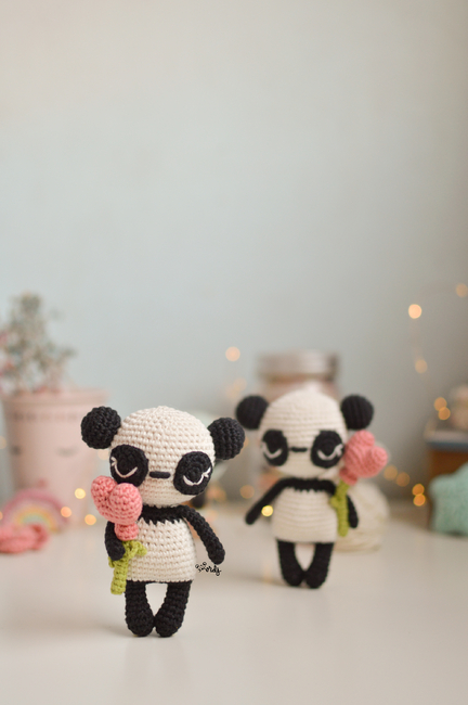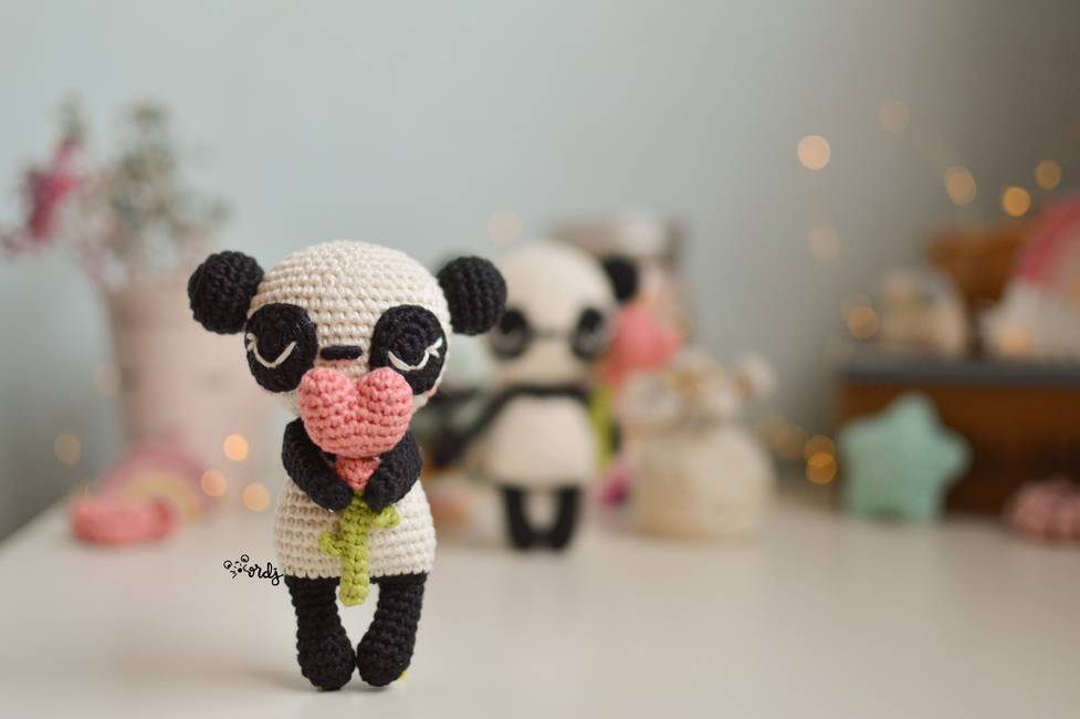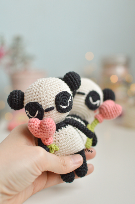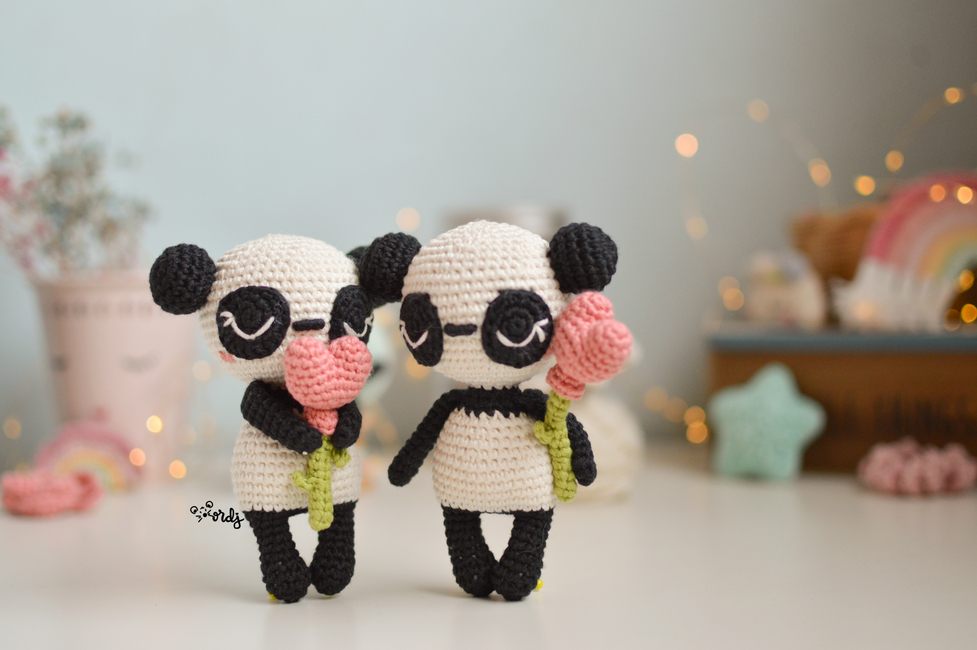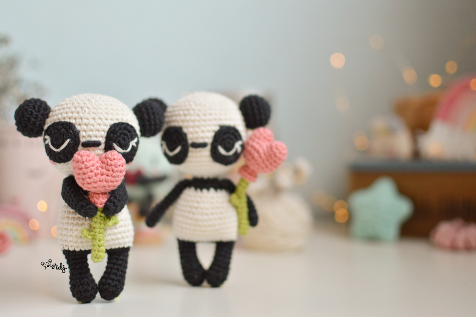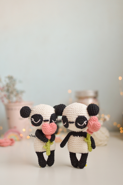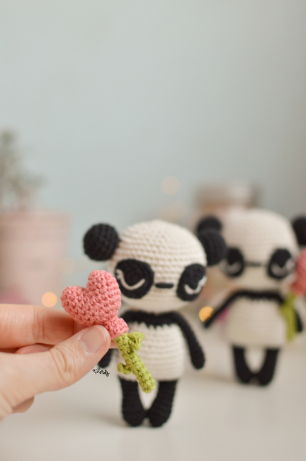 Amigurumi pattern to make an amigurumi panda with a heart balloon attached to a crochet bamboo stick.