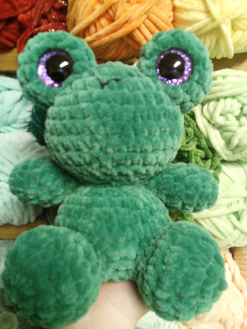 This is a low sew crochet frog plushie! The only thing you need to sew on is the little eye pieces!