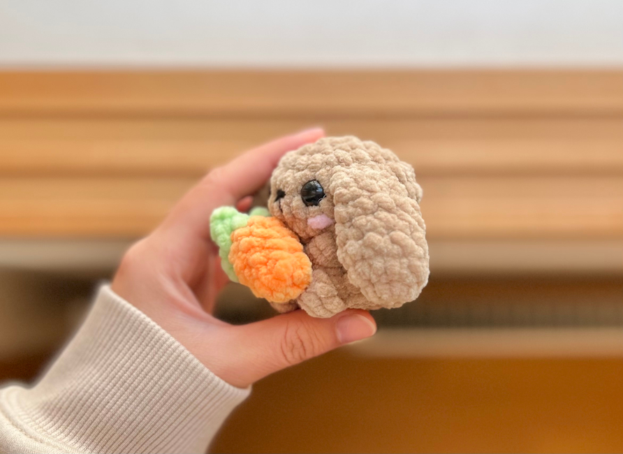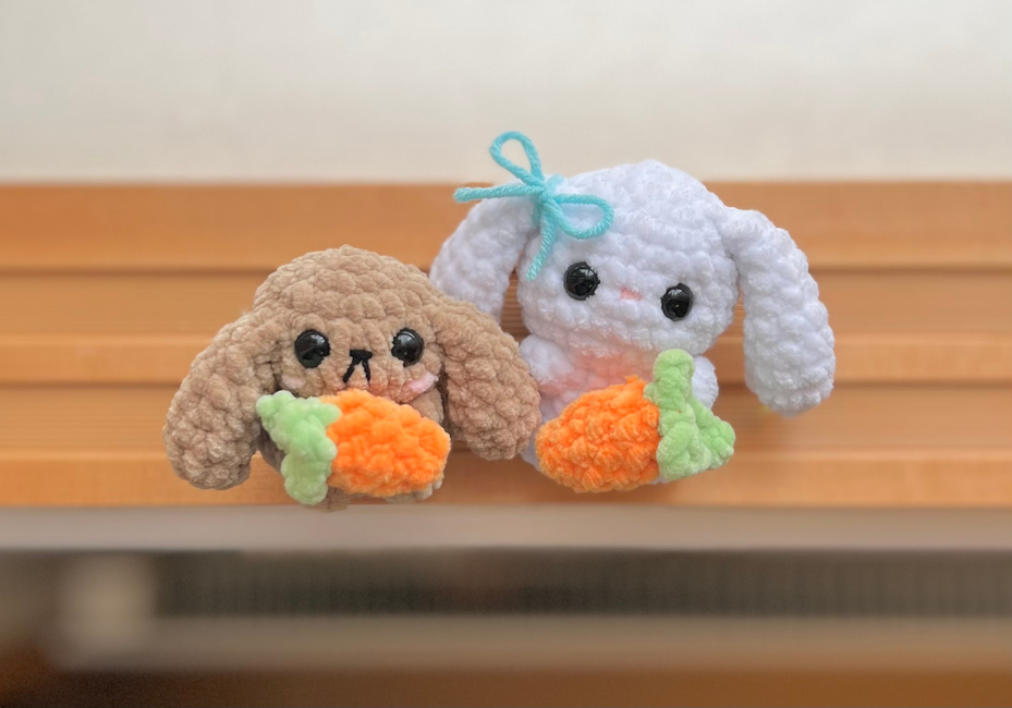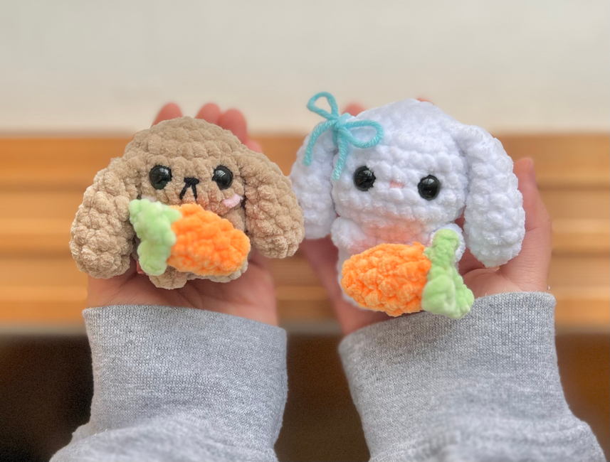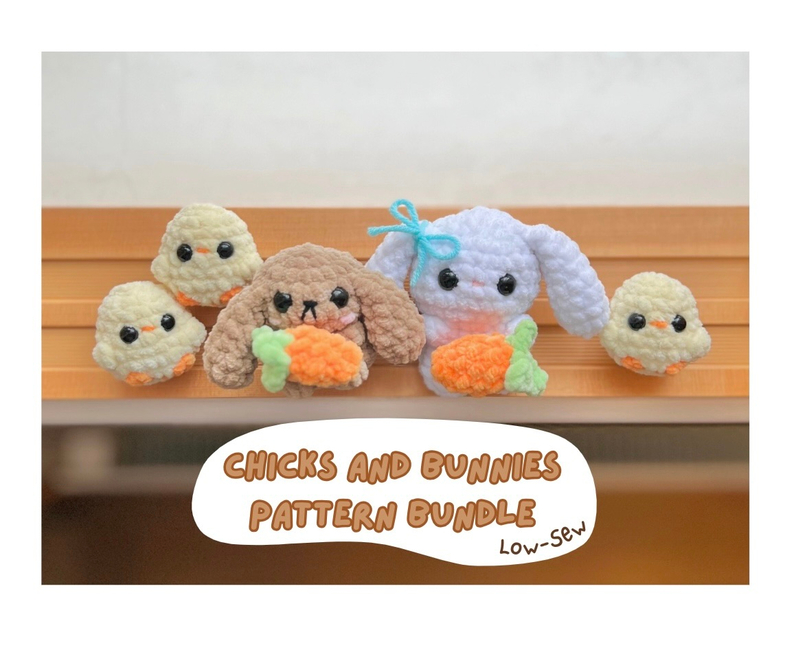 These patterns are suitable for confident beginner/intermediate crocheters and include pictures to help along the way. The only part of the bunny patterns that involves sewing is attaching the carrot to the bunny. The chick pattern is no-sew, but it does require minimal sewing if you want an egg that can open and close.