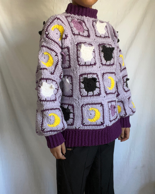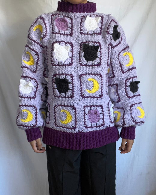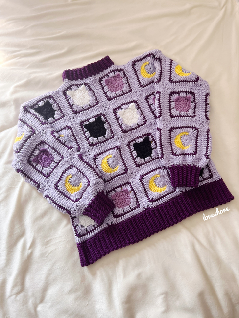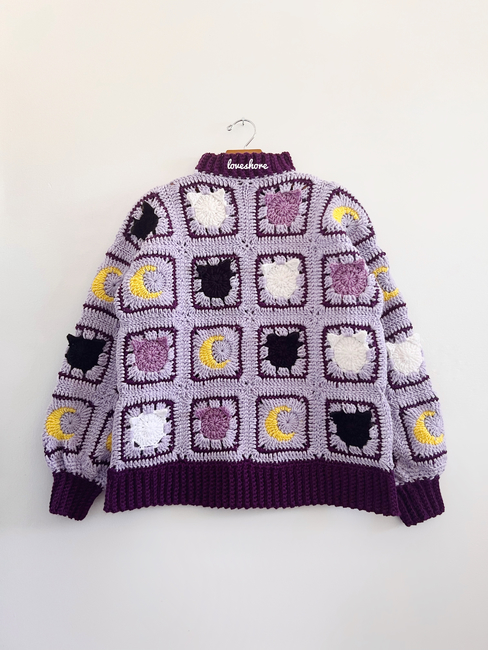 Create this cat and moon granny square sweater that is intermediate-friendly and comes with a XS-5XL size chart. The pattern explains how to create all four panels including the cat and moon granny square. You have the option to create this cardigan in any color and size that you want.
