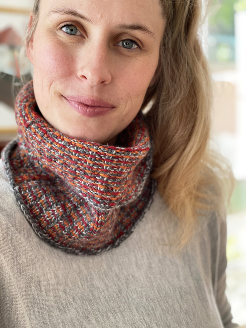 The Lyng cowl is a cozy reversible cowl! We love that this cowl looks like complicated colorwork but it is actually super easy stripes with slip stitches. The cowl's base is doubled stranded with Allagash and Winter Blossom then the contrasting stripes are worked in just Allagash.