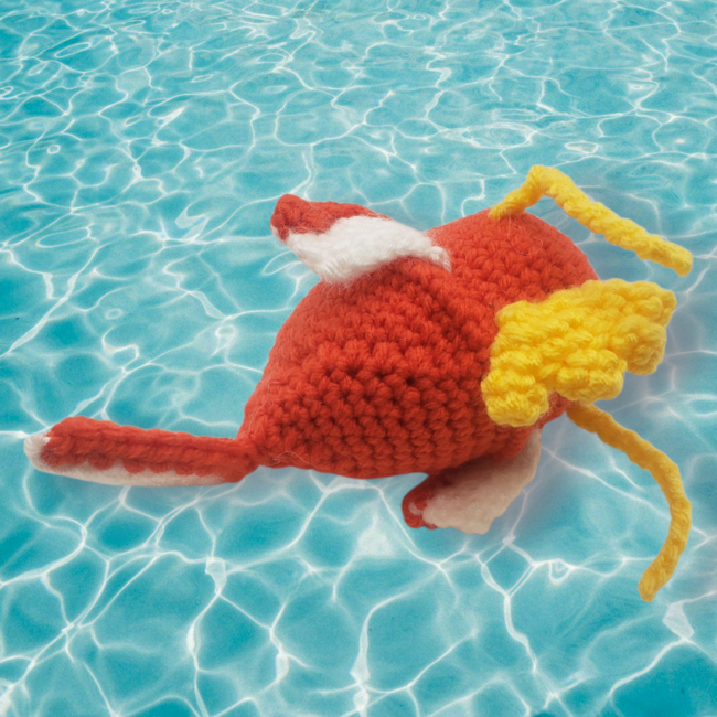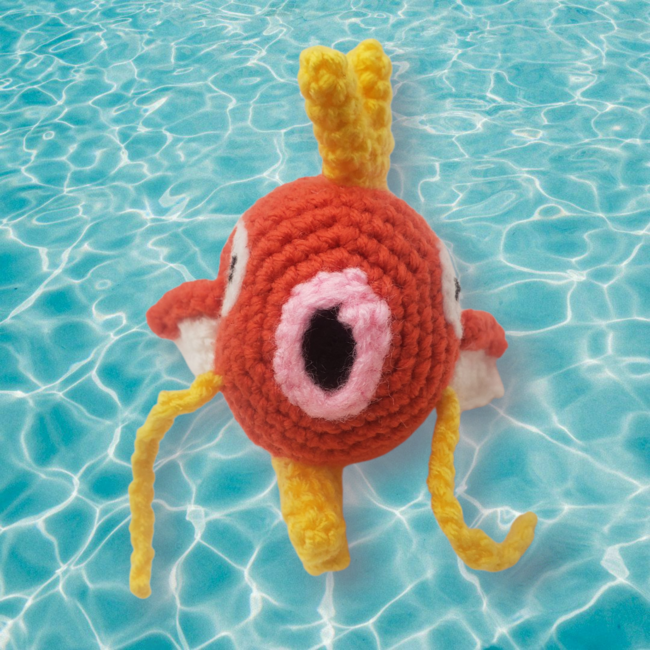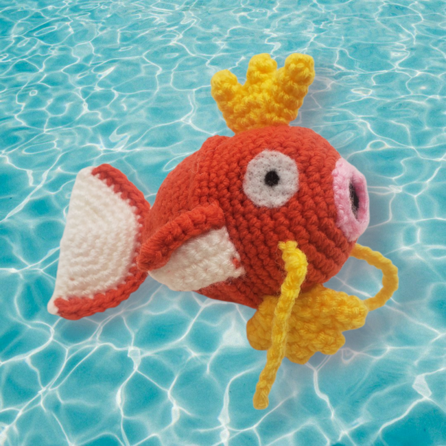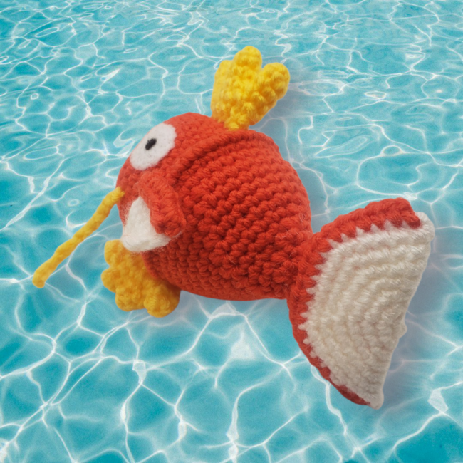 Crochet the weak (but endearing) Pokémon, Magikarp! This fish Pokémon originates from Pokémon Red, Blue, and Green, but can be found in almost all Pokémon titles!
