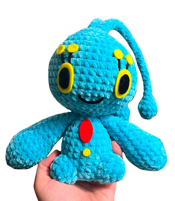 Make an adorable Manaphy from Pokemon! Use pipe cleaners or wire (if desired) to get the antenna to be a bit more supported. Felt and embroidered details really bring the character to life! The main plush is made with only one color of yarn so even though the pattern looks intimidating, it comes together fairly quickly.