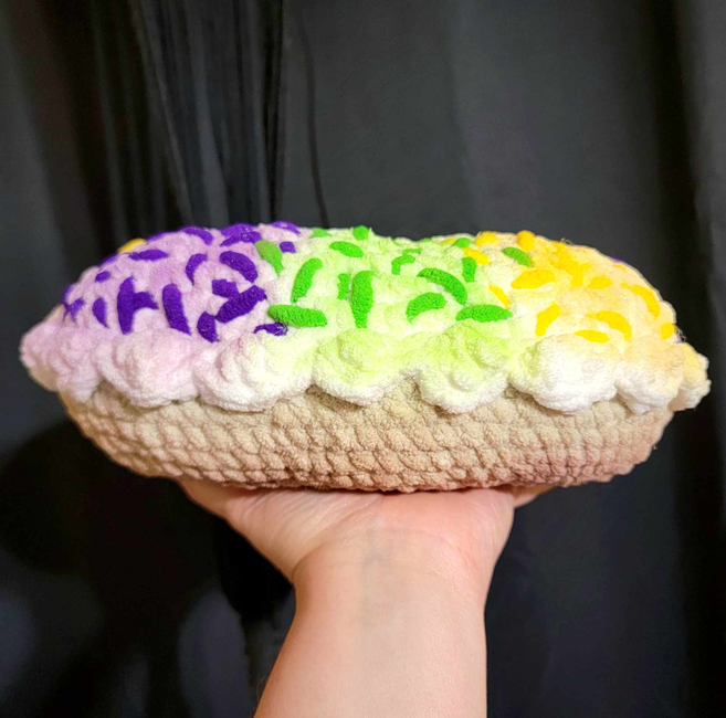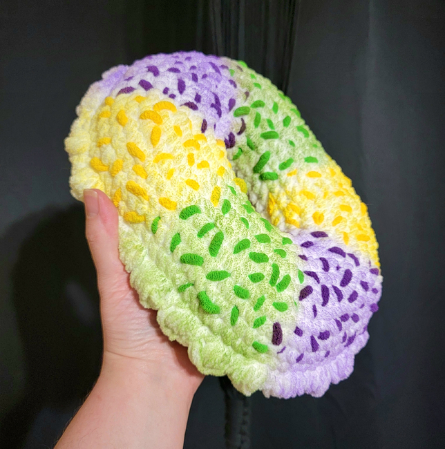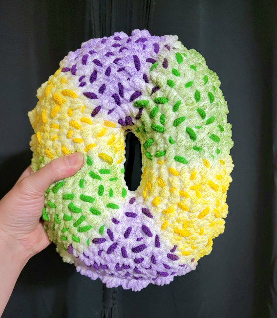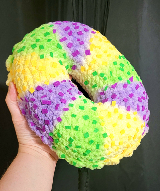 CheriReeCrochet designed the Mardi Gras King Cake Plush pattern. Find more of their patterns on their Ribblr shop page.