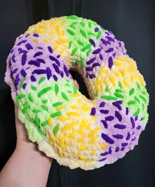 Create your own cozy slice of Mardi Gras magic with this delightful King Cake Plush Pillow crochet pattern! Designed to resemble the iconic dessert, this pattern uses size 6 blanket yarn and a 6mm hook to craft a soft and huggable pillow. However, it's versatile enough to work with any yarn and hook size, allowing you to customize the finished size to your preference. Perfect for advanced beginners, this project offers just the right mix of simplicity and creative possibilities.