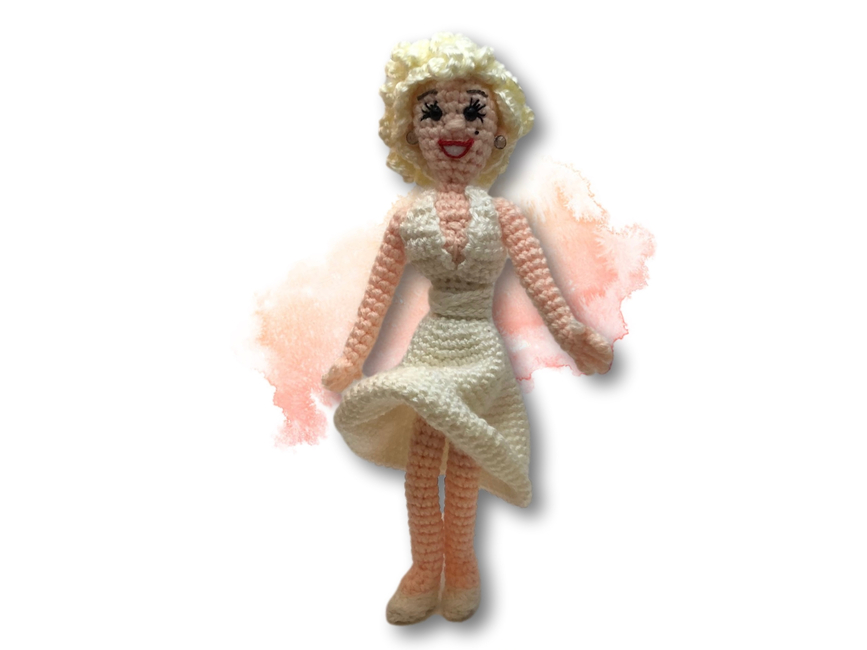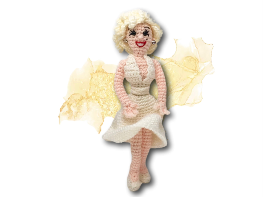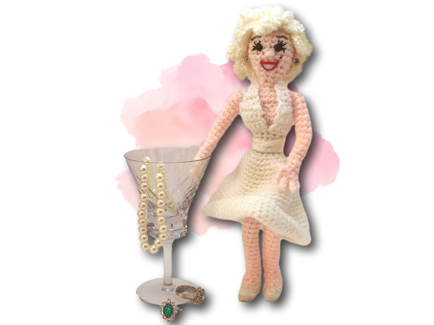 Crafted in the glamour of old Hollywood, this Marilyn Monroe-inspired doll, standing 9 inches tall and worked in worsted weight yarns, boasts wired, posable limbs for that classic starlet pose. Immerse yourself in the golden era with this pattern, adorned with over 30 photos to guide you. May your crochet journey is as enchanting as Marilyn's timeless allure!