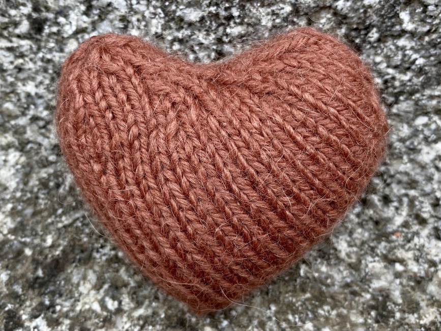 Gauge is not crucial for this project, but you should work tight enough so the heart is shaped well and the stuffing is not visible. Choose needles 2-3 mm smaller than the size recommended on the yarn label.