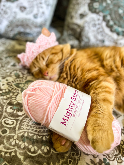 To make Maybelline’s Cat Crown you will need: 6-10 grams of Mighty Stitch worsted yarn, 15 beads with at least 2mm opening (big enough for a tapestry needle with yarn to pass through). Tools required: 4.00mm crochet hook, tapestry needle.