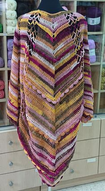 This is a very substantial and warm cape style shawl. The design allows very easily for adaption of length.