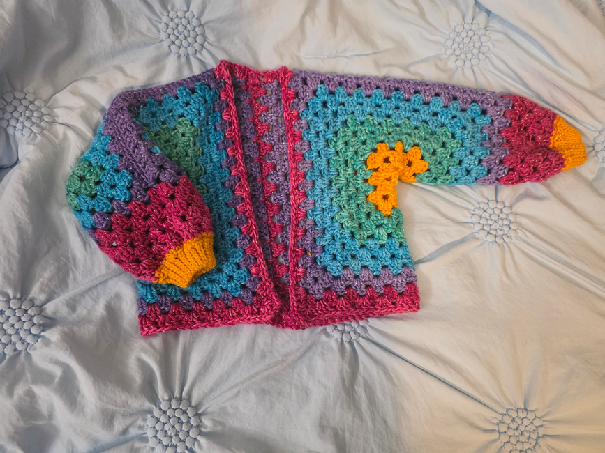 I made this adorable hexagon cardigan for my 3 year old daughter. If you are making it for your child, I suggest letting your little one pick out the yarn. That's what I did, and she was so excited for the finished piece.