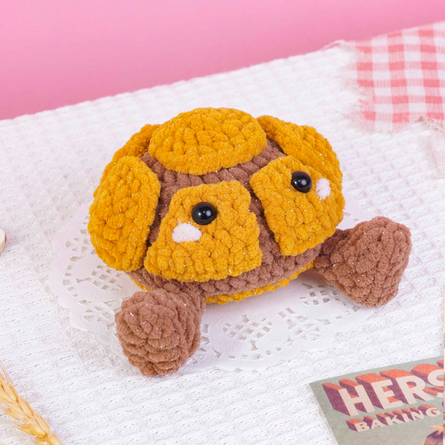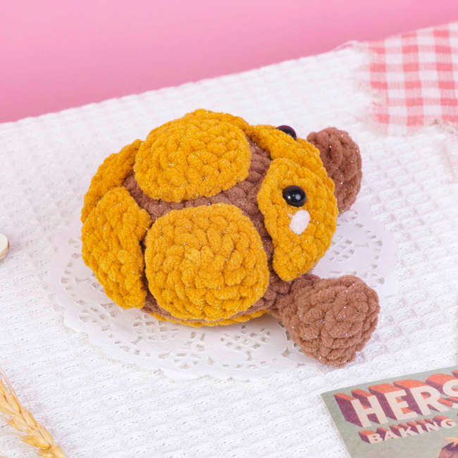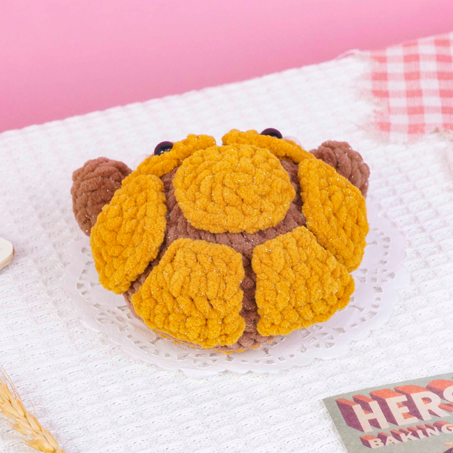 To make Melon Pan Cake Crochet Pattern you will need: Color: Brown, mustard yellow, pink, Stitch markerSewing needleScissorsFiberfillPlastic safety eyes (9mm x2)Hot glue gun. Tools required: 4mm (G/6) Hook.