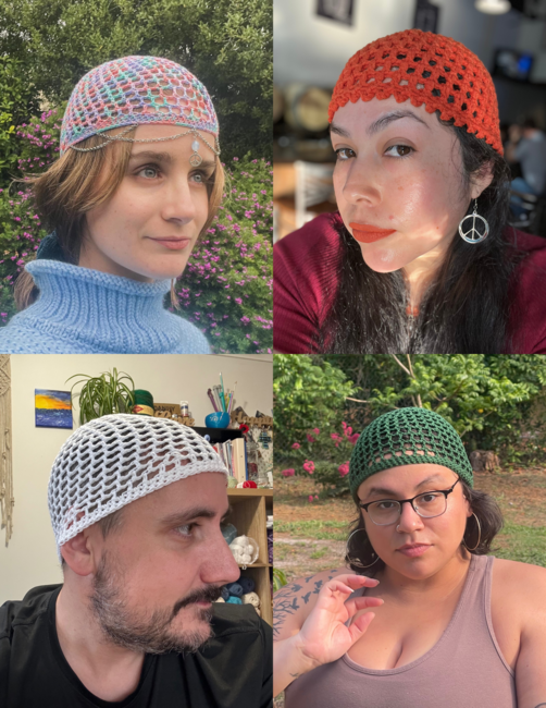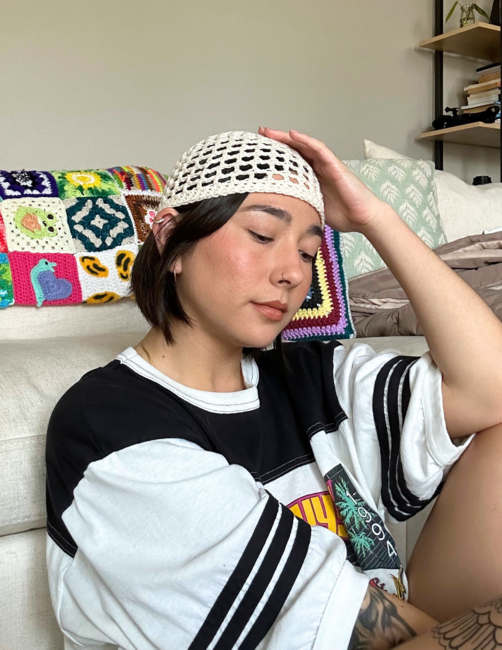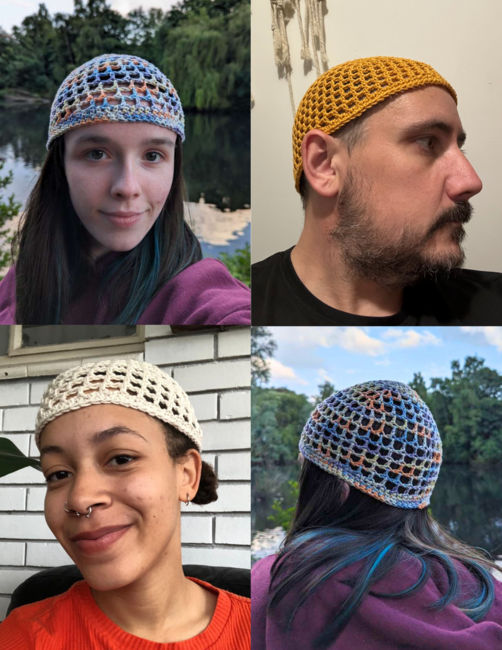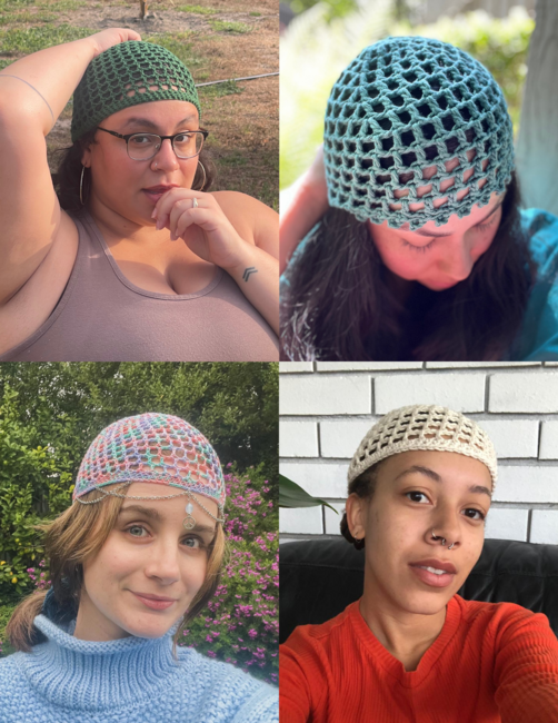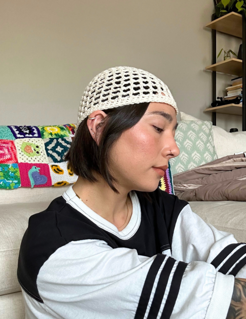 The Meshi Cap is a stylish headwear accessory, suited perfectly for beginners. This design is made with a mesh pattern, and features a tapered fit to shape the head. The fiber content of this project is a cotton/silk blend - allowing for slight stretch, breathability & softness against skin.