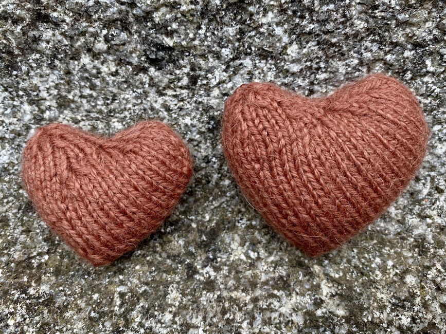 Gauge is not crucial for this project, but you should work tight enough so the heart is shaped well and the stuffing is not visible. Choose needles 2-3 mm smaller than the size recommended on the yarn label.