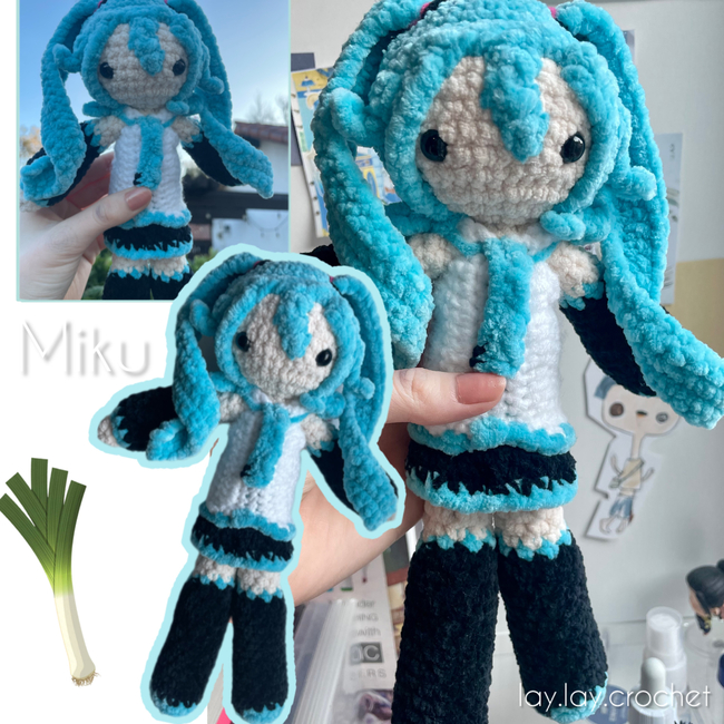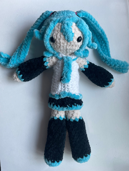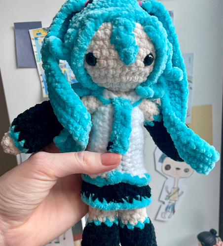 Hatsune Miku plushie! I was so excited to share this pattern, and it's super fun to make. I would recommend for those with a little more crochet experience. But if you have any questions, feel free to dm me.