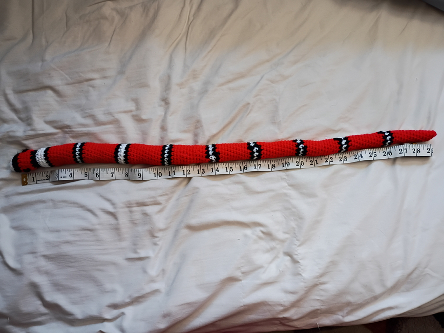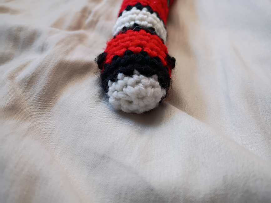 To make Milk Snake you will need: Black, white, red. Tools required: 4 mm, scissors, yarn needle.