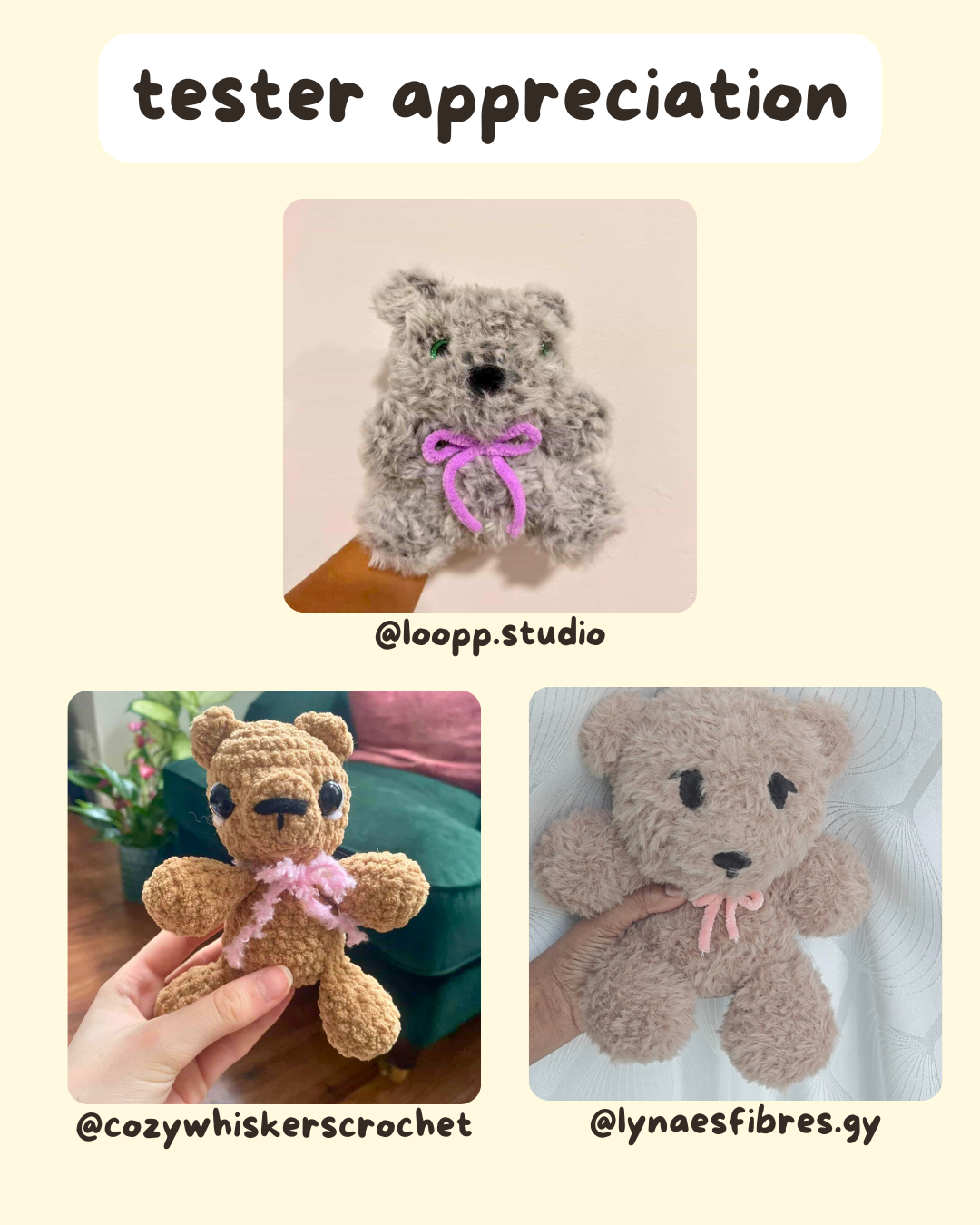 Pink Violet Handmade designed the Milo the Teddy Bear pattern. Find more of their patterns on their Ribblr shop page.