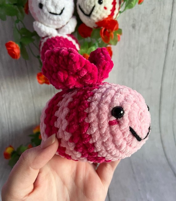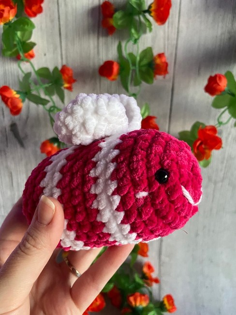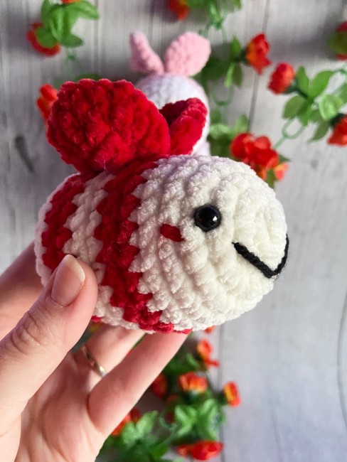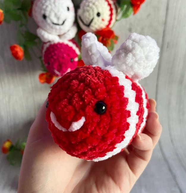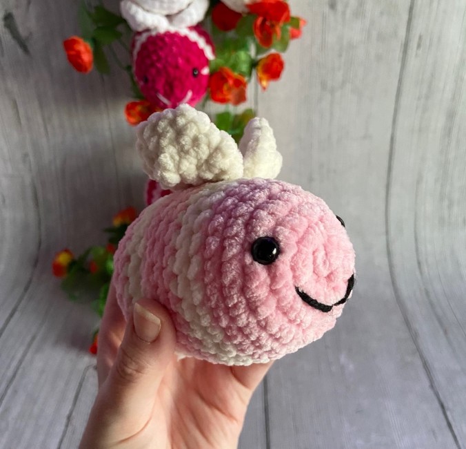 Using chenille (#4) yarn and a 5mm hook = my finished bee measured 4 inches tall from tip of wing to bottom of plushie. You can of course use any yarn/yarn weight and hook size combination to make your own plushie but just be aware that your finished size will differ from mine.