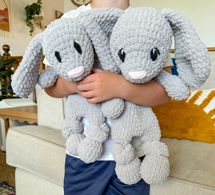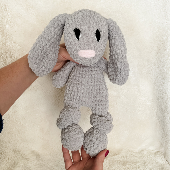 This crochet bunny snuggler is a mix between a stuffed animal and a blanket - in miniature form! The hands, feet, and head are stuffed, but the body is a cozy blanket like feel. The finished project is about 12 inches tall (see photos for comparison on original pattern size).
