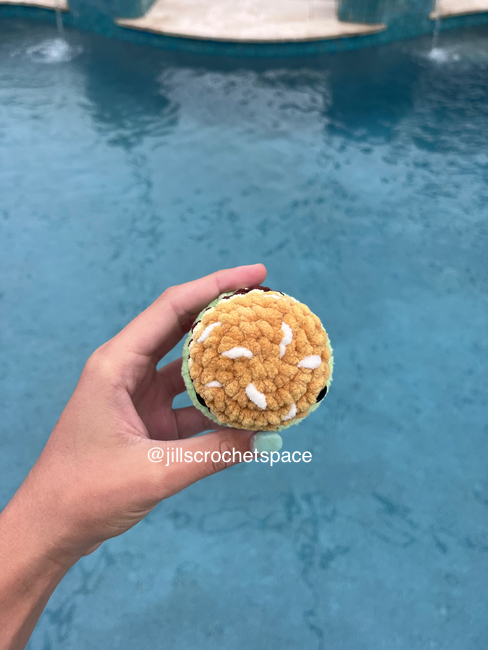 This is a mini burger pattern that is easy to make! It's no-sew, excluding having to sew on a mouth or seeds if chosen to. You can give it eyes and a mouth to make it a burger buddy or you can choose not to and just make it a regular burger!