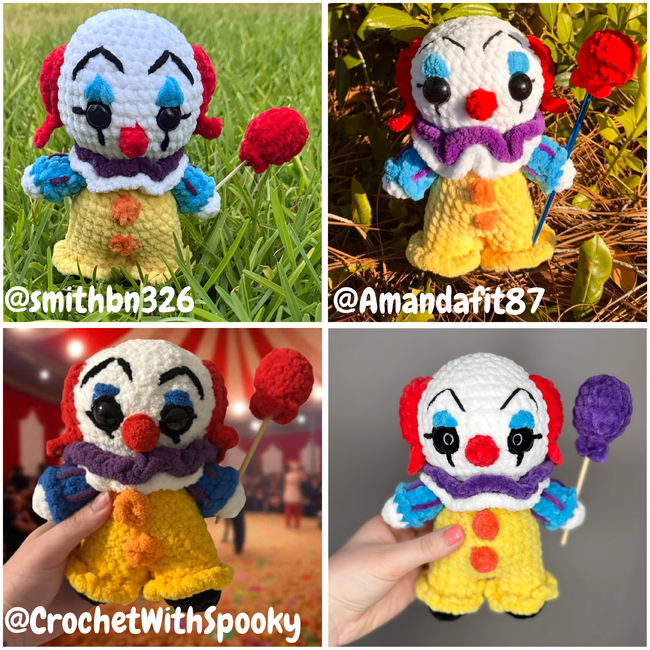 Feet and eye detail color (small amount of parfait chunky by Premier Yarns in color black) Body color (less than 1/4 of a skein of parfait chunky by Premier Yarns in color sunshine) Head, collar, and hands color (1/4 of a skein of parfait chunky by premier yarns in color white) Hair and nose color (less than 1/4 a skein of parfait chunky by Premier Yarns in color poppy) Arms and eyeshadow color (small amount of toucan by Hobbii in color dark turquoise) Stripe details, collar, and balloon color (small amount of parfait chunky by Premier Yarns in color iris) Buttons color (small amount of parfait chunky by Premier Yarns in color mango) Eyebrows color (small amount of any black worsted weight yarn)