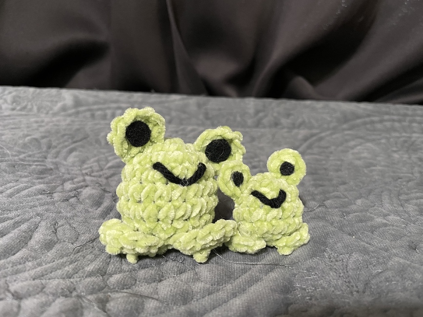 This tiny little frog is perfect for when you want to make something quickly. I used a light weight yarn. I believe it was around a 3 weight but not 100% as I dont have the tag anymore. A larger weight yarn will result in a bigger frog and a lighter weight yarn results in a smaller frog. The eyes and feet are sewn on to the body and I used felt for the eyes.