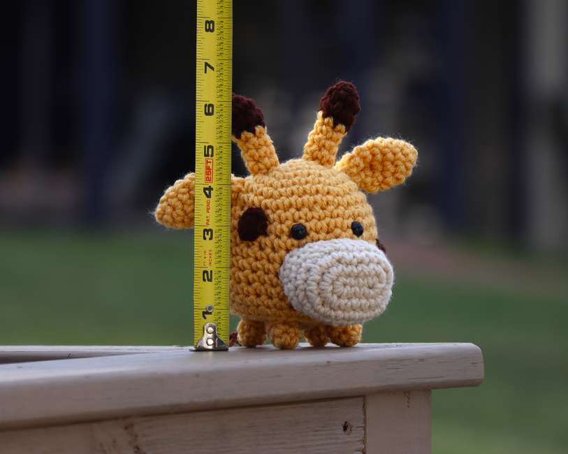 The mini giraffe measures approximately 5.5" tall (sitting) by 7.5" wide (including ears).