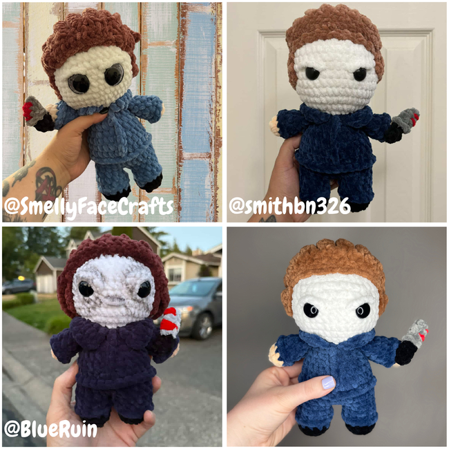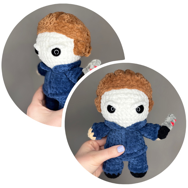 Legs, body, collar, and arms color (less than 1/2 a skein of parfait chunky by Premier Yarns in color navy) Head and eyelids color (1/4 of a skein of parfait chunky by Premier yarns in color white) Hair color (1/2 a skein of parfait chunky by Premier Yarns in color teddy bear) Hands color (small amount of parfait chunky by Premier Yarns in color shell) Feet and knife handle color (small amount of parfait chunky by Premier Yarns in color black) Knife blade color (small amount of parfait chunky by Premier Yarns in color seal) Blood color (small amount of parfait chunky by Premier yarns in color poppy)