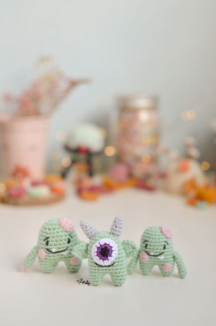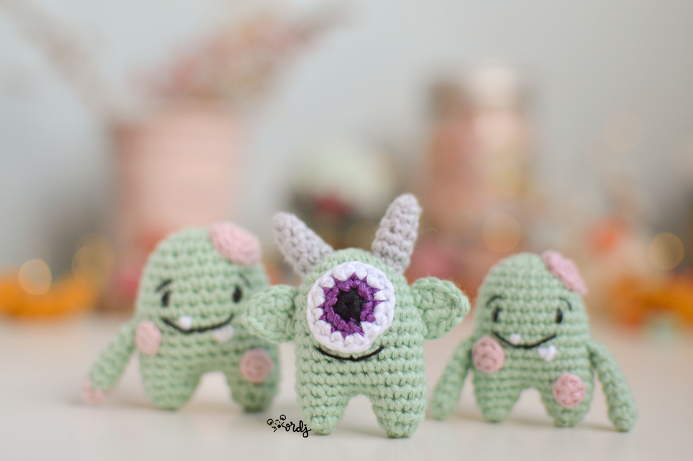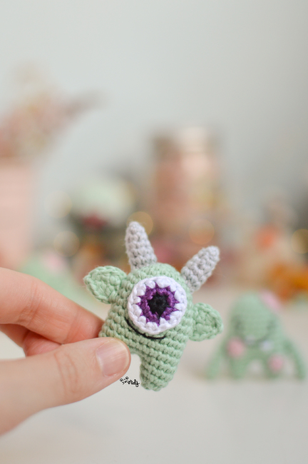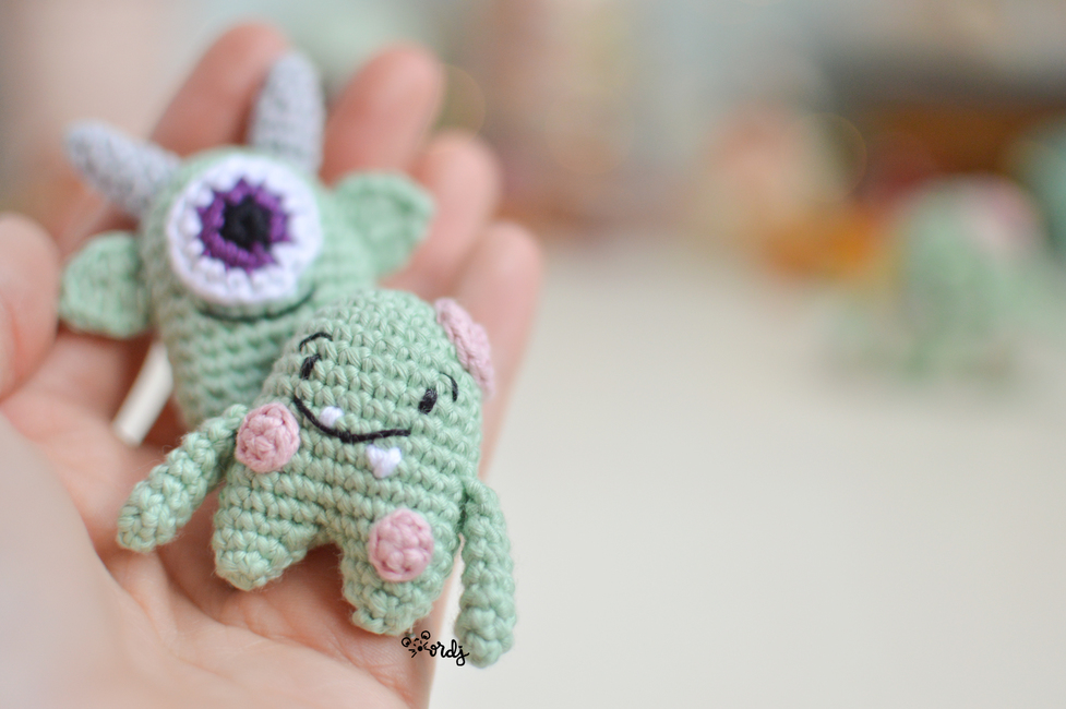 Pattern and tutorial to make 2 different mini amigurumi monsters.