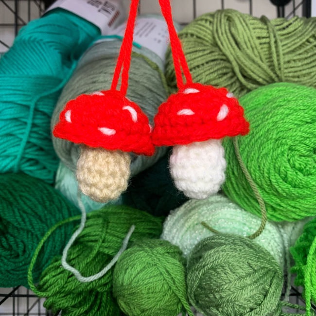 These mini mushrooms are super customizable, quick and easy to whip up, and are a great way to use up leftover bits of yarn. Feel free to change up the color of the cap, stem, speckles, or all three to make yours exactly how you want it!
