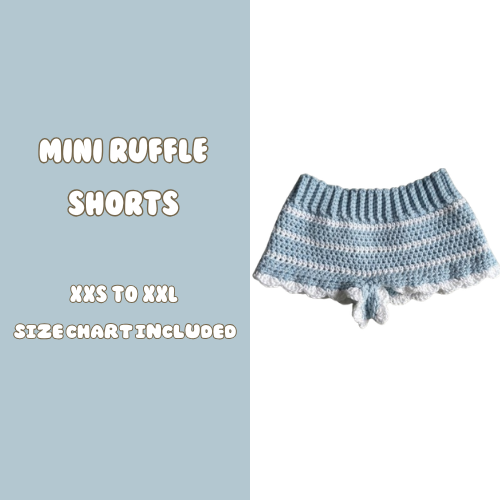 Mini Ruffle Shorts is a Beginner Crochet pattern designed by imcoralcrochet for making a Clothing. A cute crochet mini shorts with ruffe edges Beginner to advanced beginner YARDAGE INFO (so you can plan the yarn before buying the pattern)| Size | Yardage || ---- | --------- || XXS | 180220 m || XS | 200240 m || S | 220260 m || M | 25...