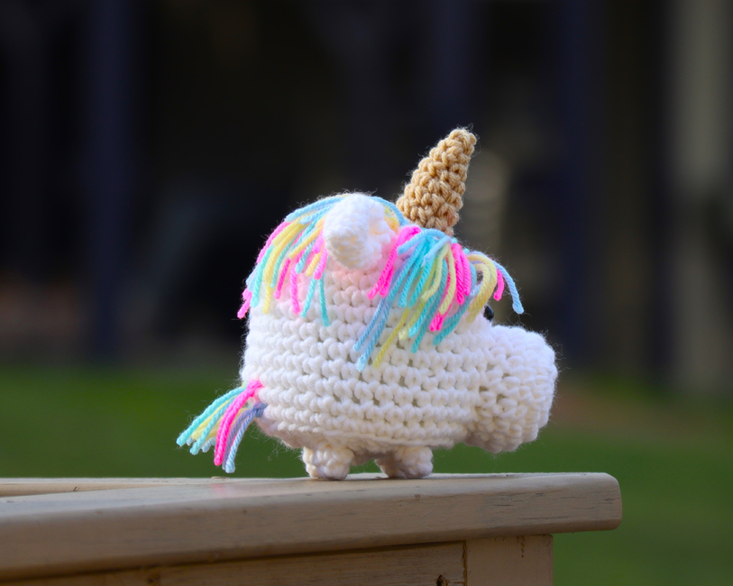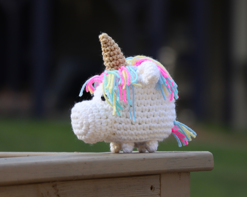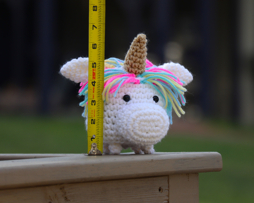 The mini unicorn measures approximately 6.5" tall (sitting) by 7.5" wide.