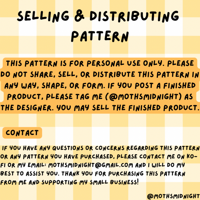 Please do not share, sell, or distribute this pattern in any way, shape, or form. Feel free to sell and post your finished product as long as you credit me as the designer.
