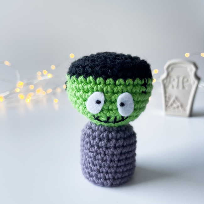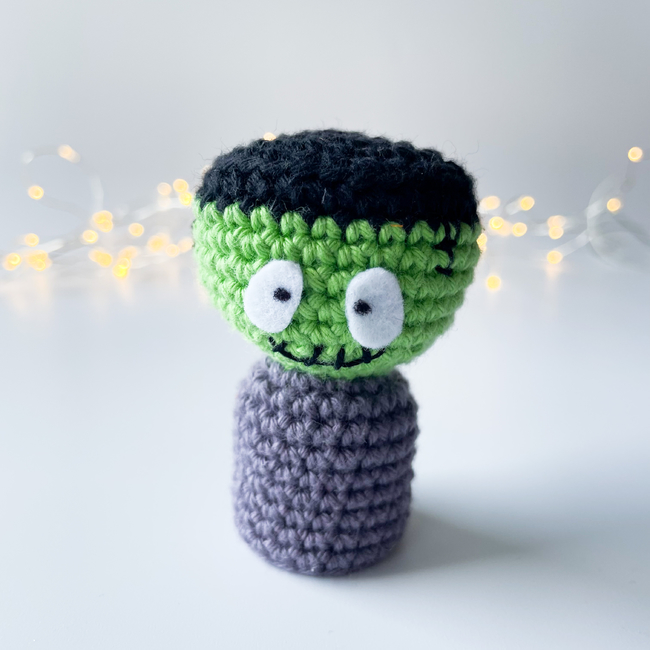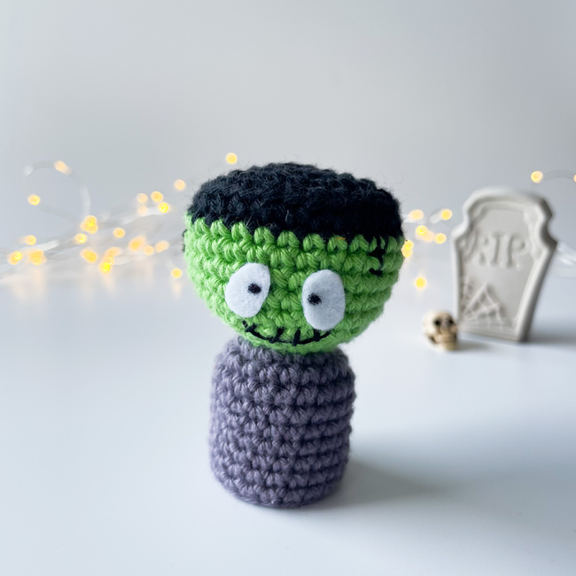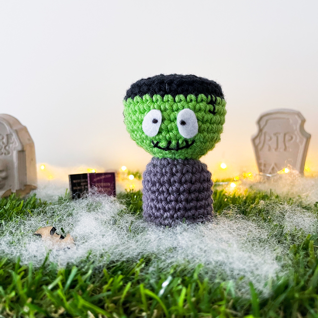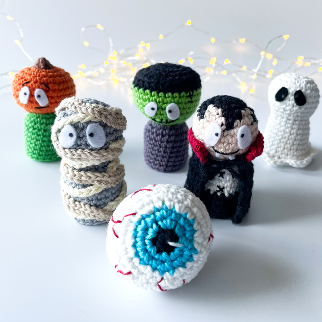 Gene the Monster is part of the BOWLOWEEN collection, which includes 5 no-sewing amigurumi-pins and one big eye ball to play bowling with your Halloween characters.