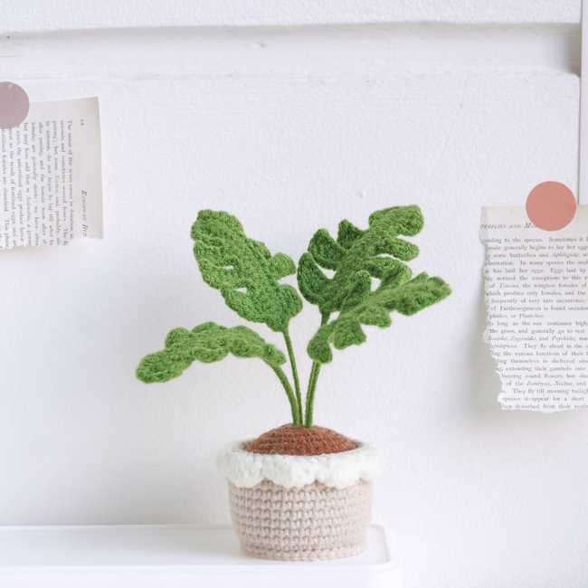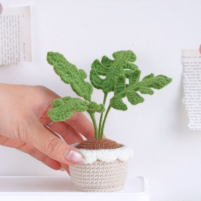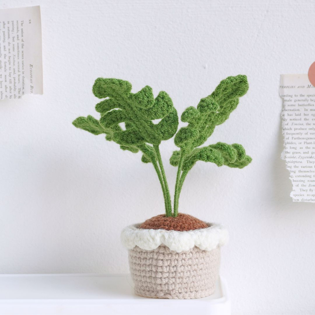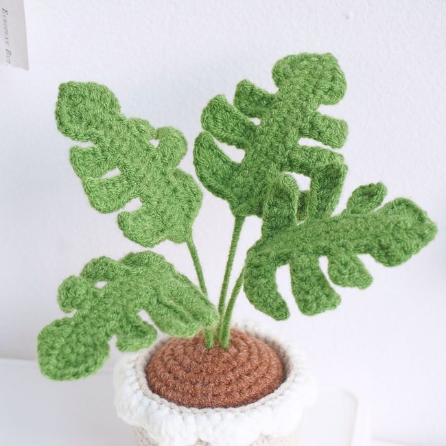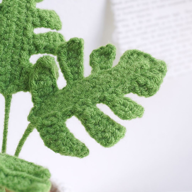 Unleash your creativity with the Monstera Pot Crochet Pattern PDF pattern! This realistic Monstera crochet plant features large, intricately crafted leaves with unique cutouts. It stands proudly in a beige crochet pot accented with a white ruffled edge.