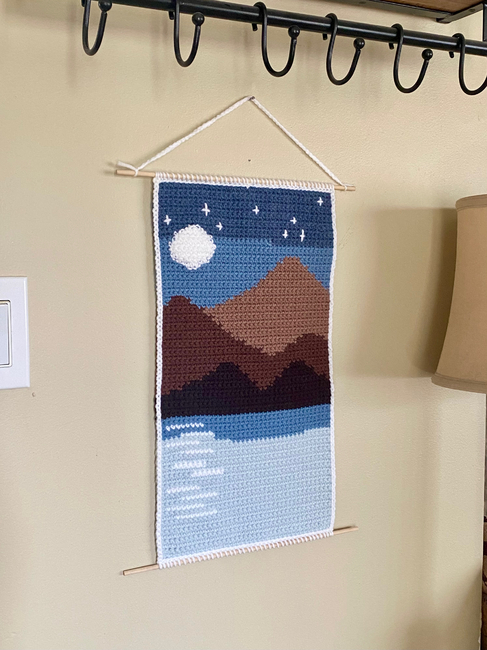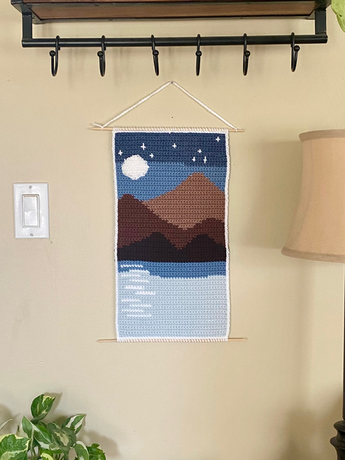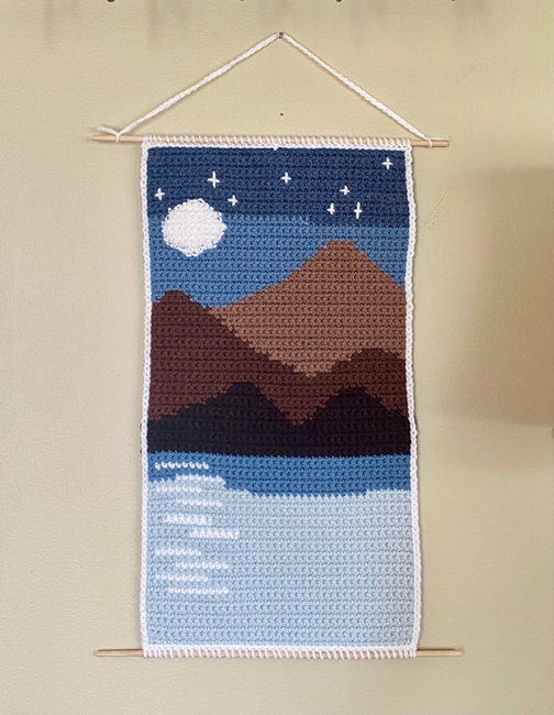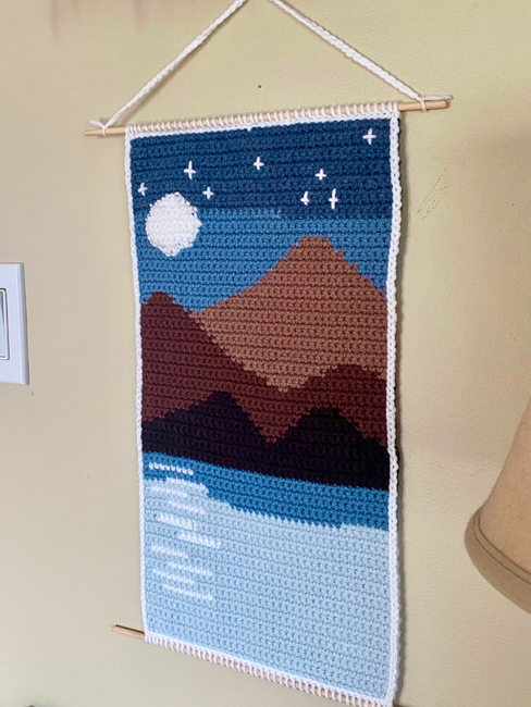 Welcome to the Moonlit Lake and Mountain Peaks tapestry crochet pattern! Please note: this pattern includes a picture of the graph as well as tips I used to crochet the piece, but does not include row-by-row instructions.