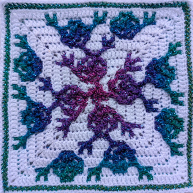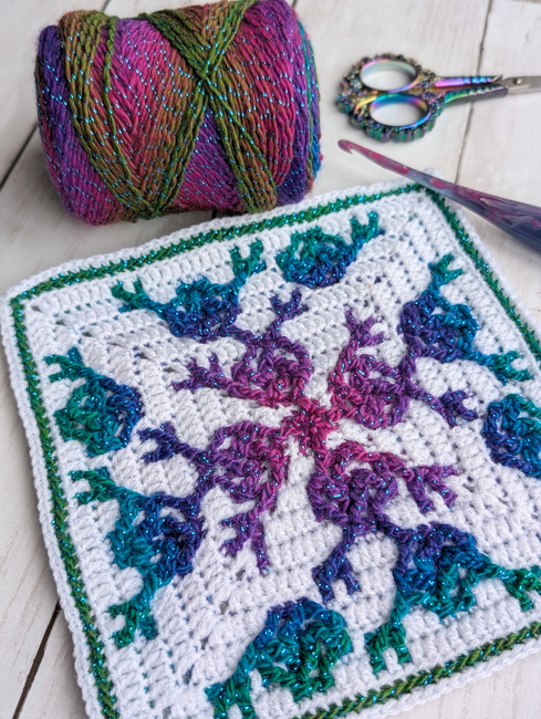 The "Moonlit Petals" mosaic crochet square is a delicate blend of geometric and floral designs, inspired by petals glowing softly in moonlight. This subtle pattern is perfect for adding a touch of elegance to your projects.