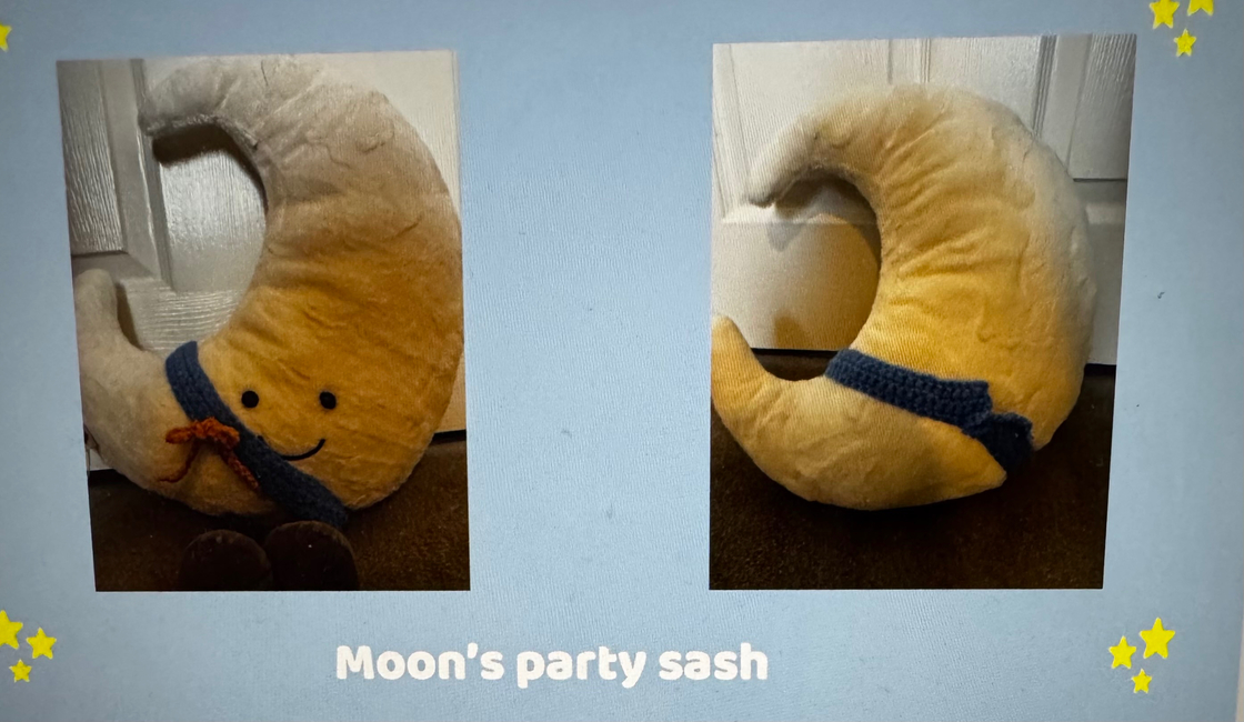 The moon loves a party so much so he has a sash for him to go. It is blue like the sky and yellow like the sun