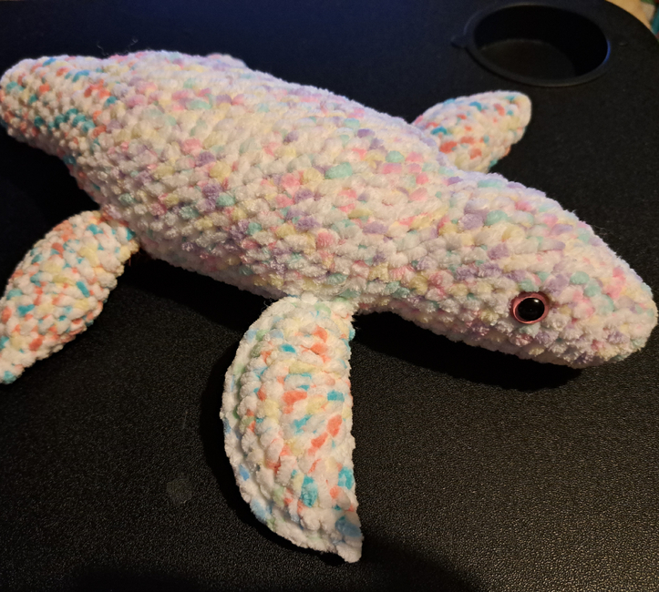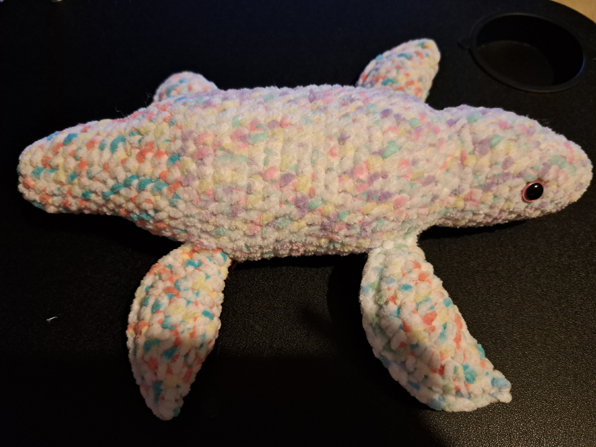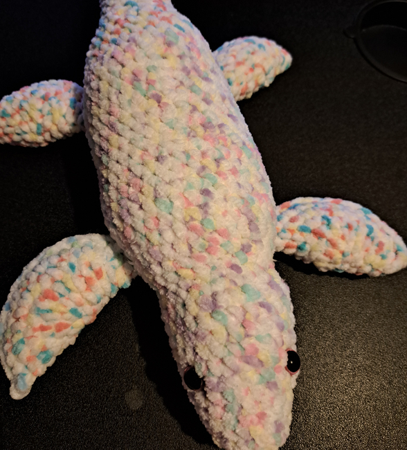 This is a low sew pattern which has 4 pieces to attatch to the main body. It's about an hour and a half to complete maybe a little longer. This pattern uses stuffed Fidget fins which makes it fun to play with and makes the fippers jump around when you play with it.